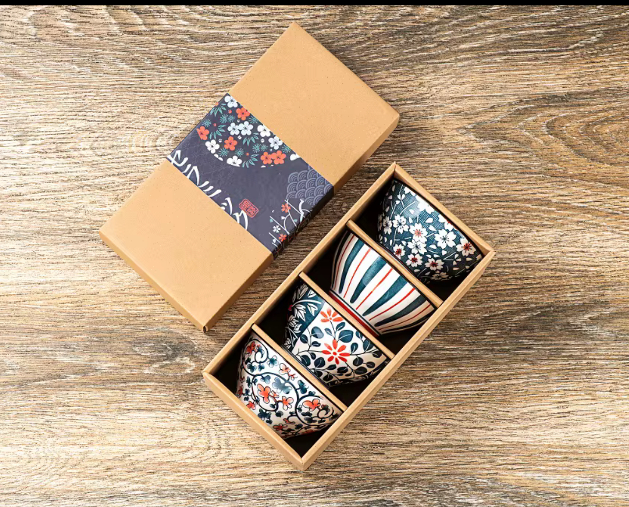 Set Ceramiche style Giapponese disegni blu e rossi 1 Piatto 4 Ciotole 4 cucchiaini bianchi ceramica